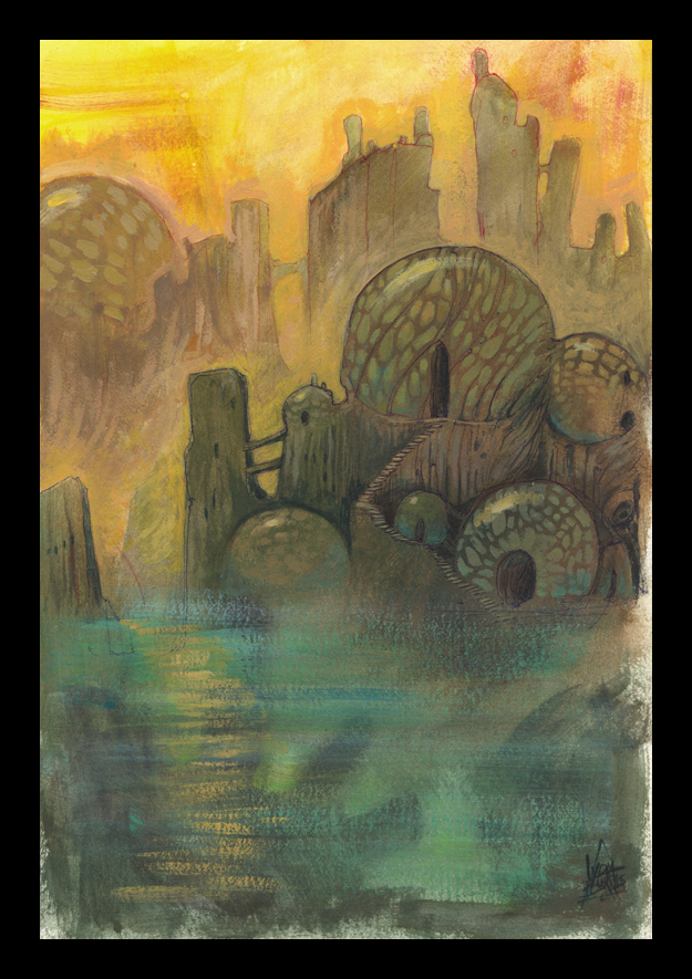 Non-Euclidean Architecture at Sunset 9"x12" commission, acrylic